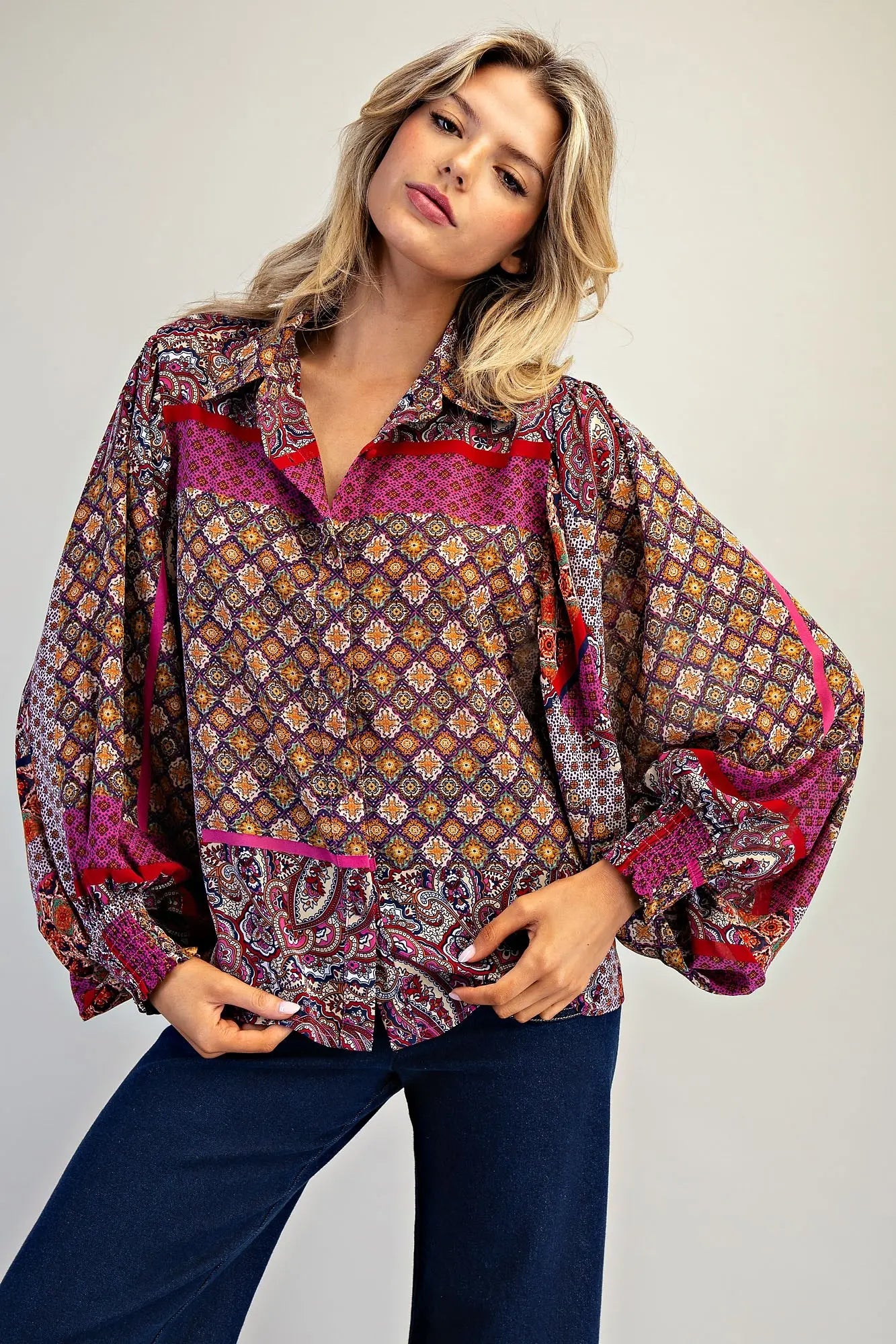 Boho collared long sleeve top with smocked cuffs, button front closure, and puff sleeves. Flowy top that's easy to wear!