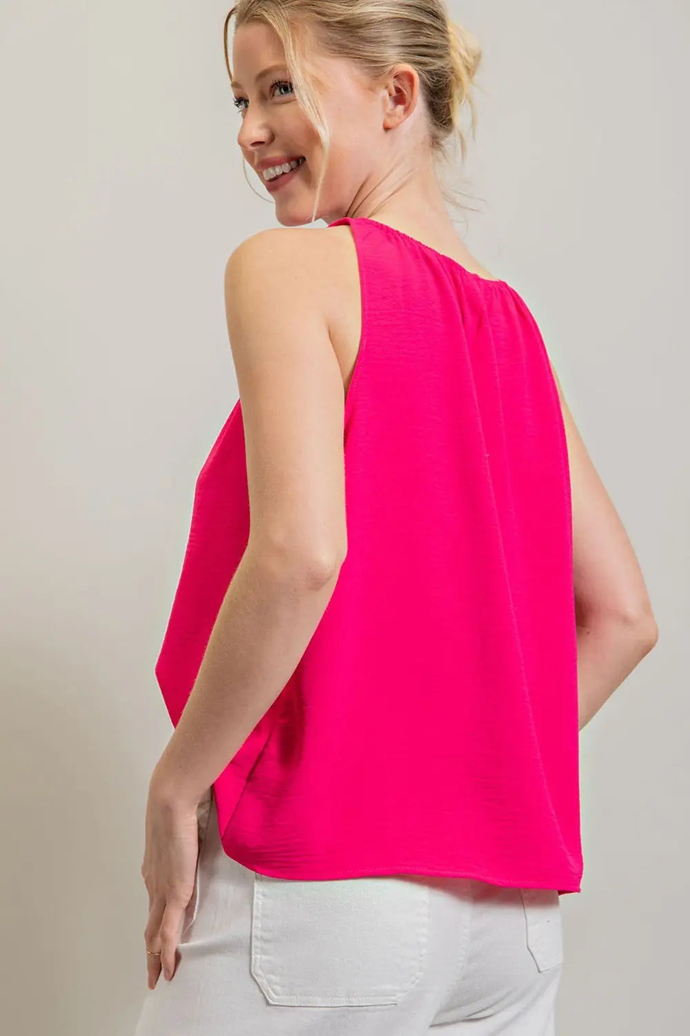Solid sleeveless top featuring a halter design, pinching for added detail, and a lightweight flowy material.