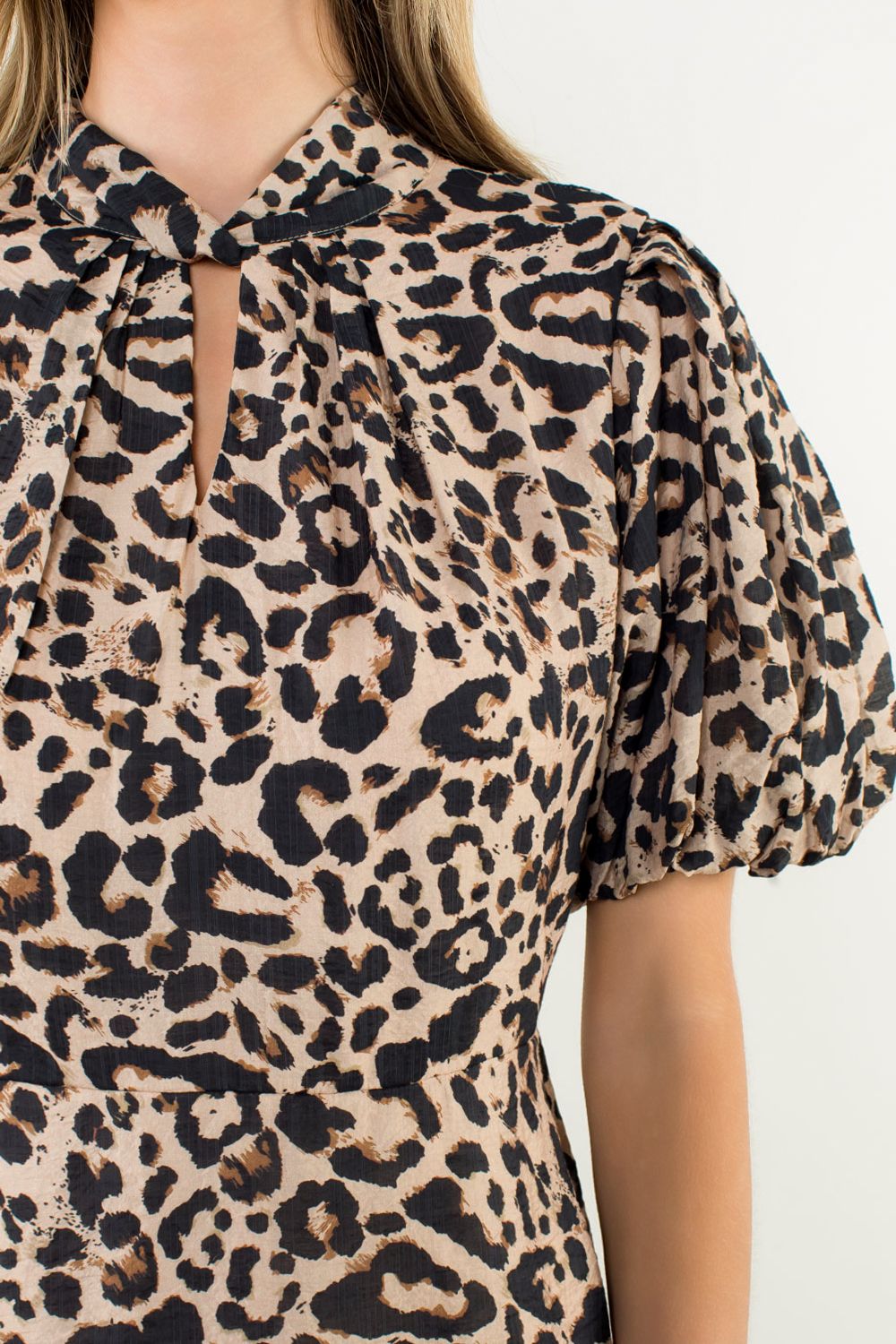 Features a self-tie keyhole neckline, puffed sleeved and a flare skirt.