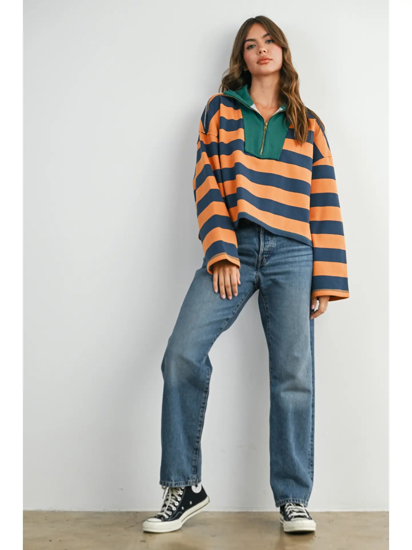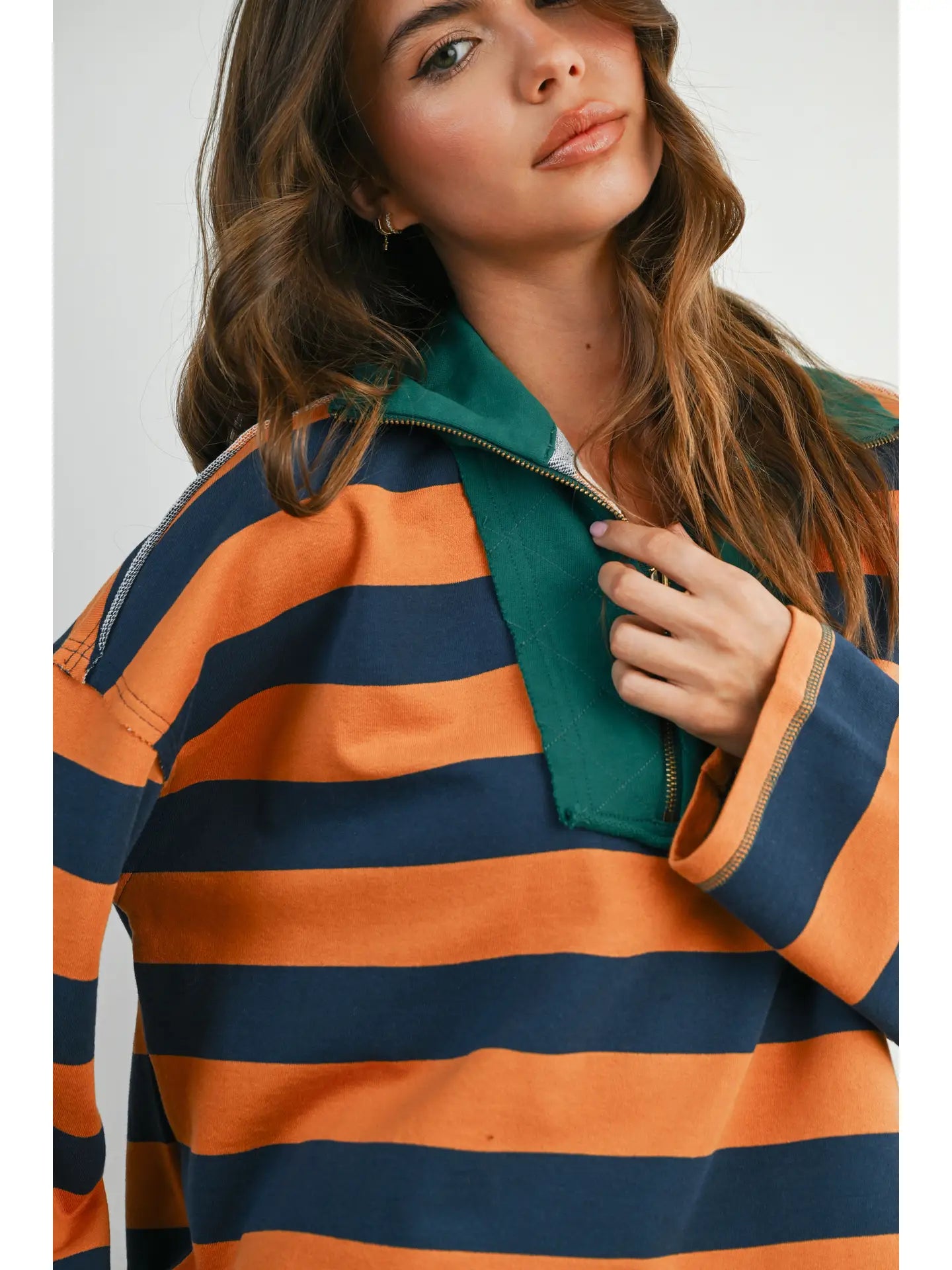 The Striped Quarter-Zip Contrast Collar Sweatshirt combines classic design with a modern twist.