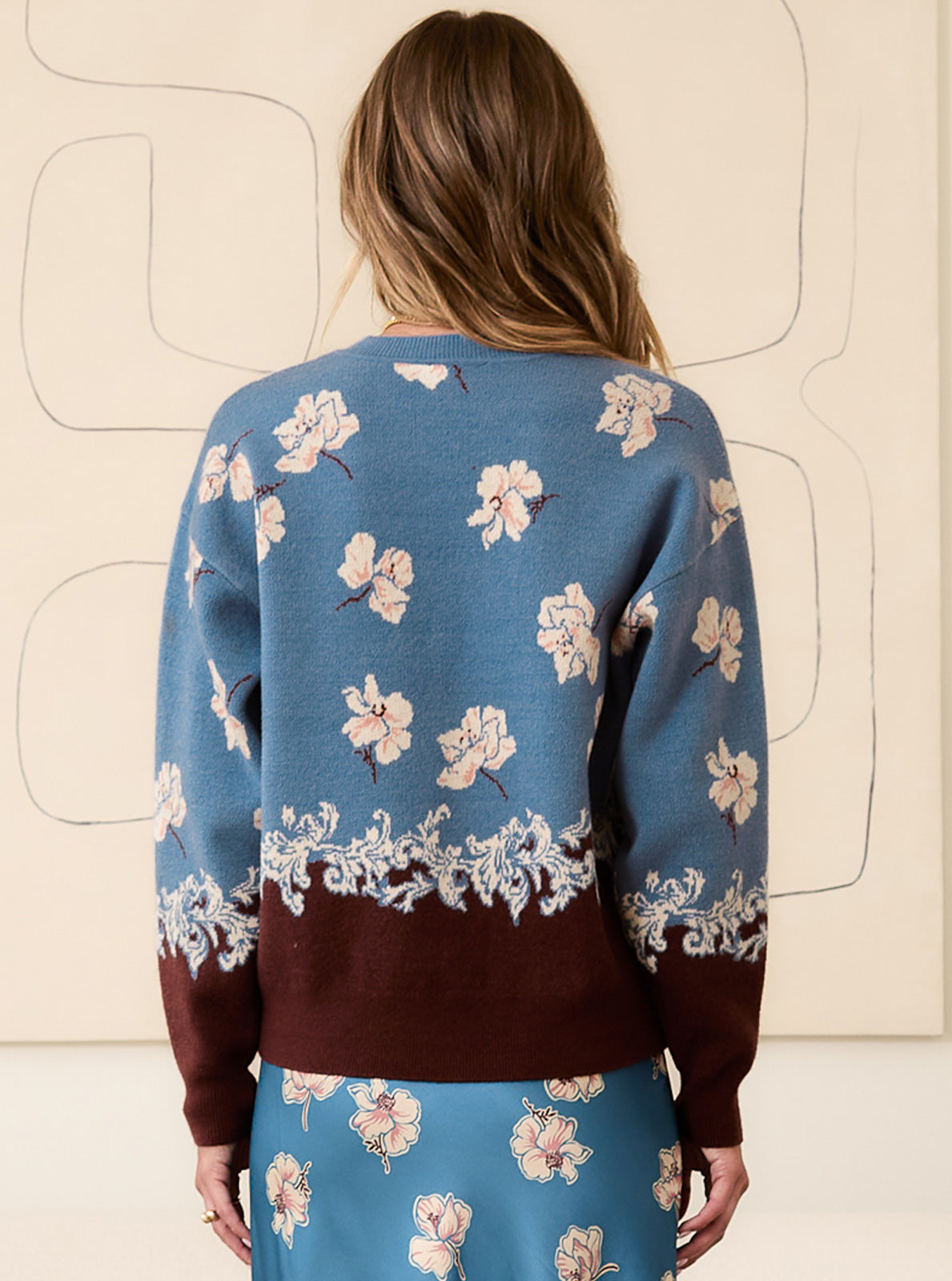 -All-over floral motif -Contrast border at hem and cuff -Ribbed crew neckline, cuffs, and hem