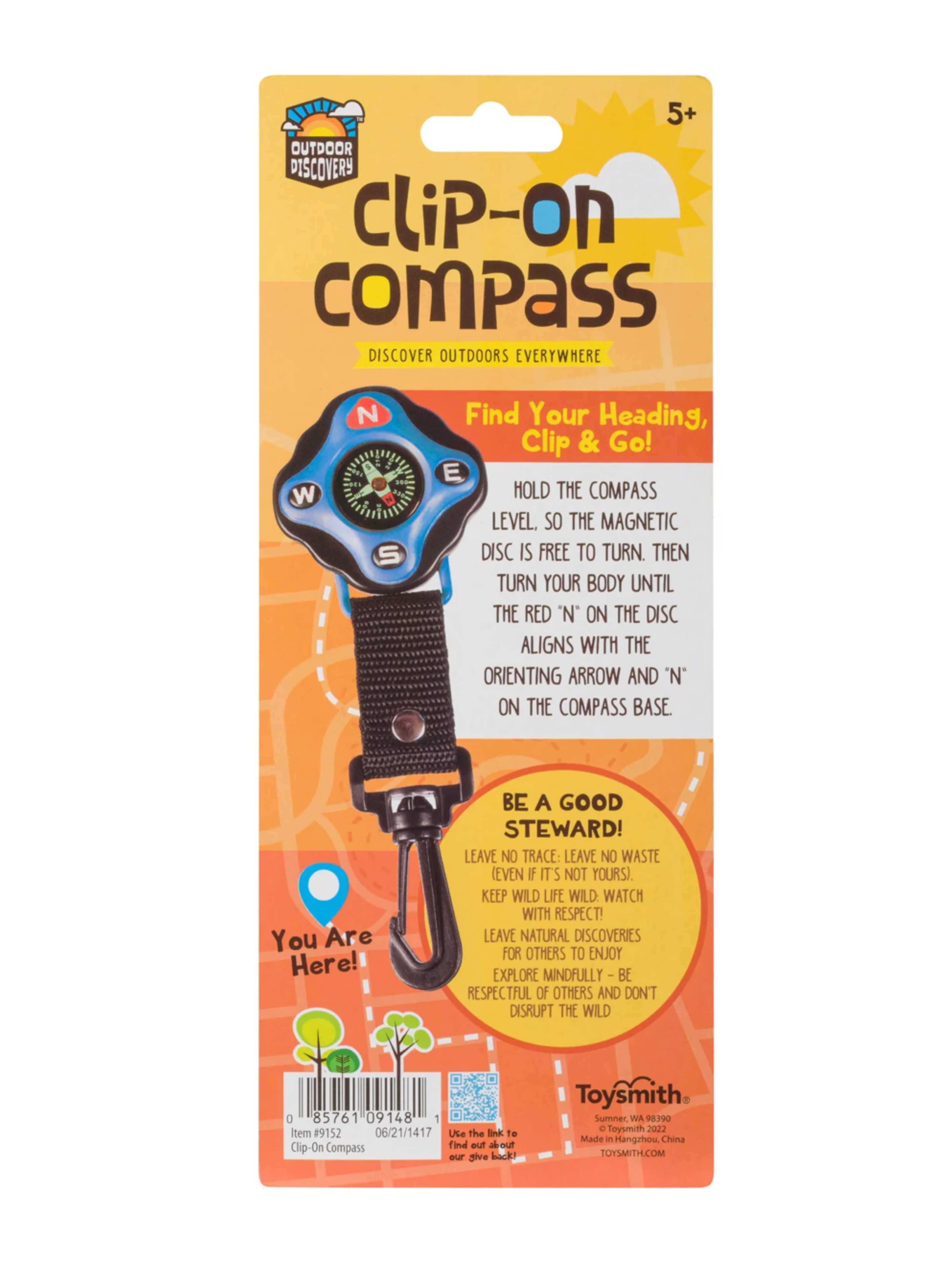 • Help kids learn how to navigate with the Outdoor Discovery Clip-On Compass that securely attaches to backpacks and belt loops. This durable compass face comes in an assortment of colors in a peggable blister packet. The rest of the compass, including the sturdy clip and nylon tether, is black. All compass faces have white letters in black circles to mark West, East, and South. North is a white N on a red circle to help kids learn how to find it faster and easier. Compass measures 6.5 inches long with a 2.5-inch square head. It’s lightweight and easy to hold, so kids can carry it while trekking in the big outdoors. This is a toy that encourages exploration, teamwork, and self-led discovery and learning.