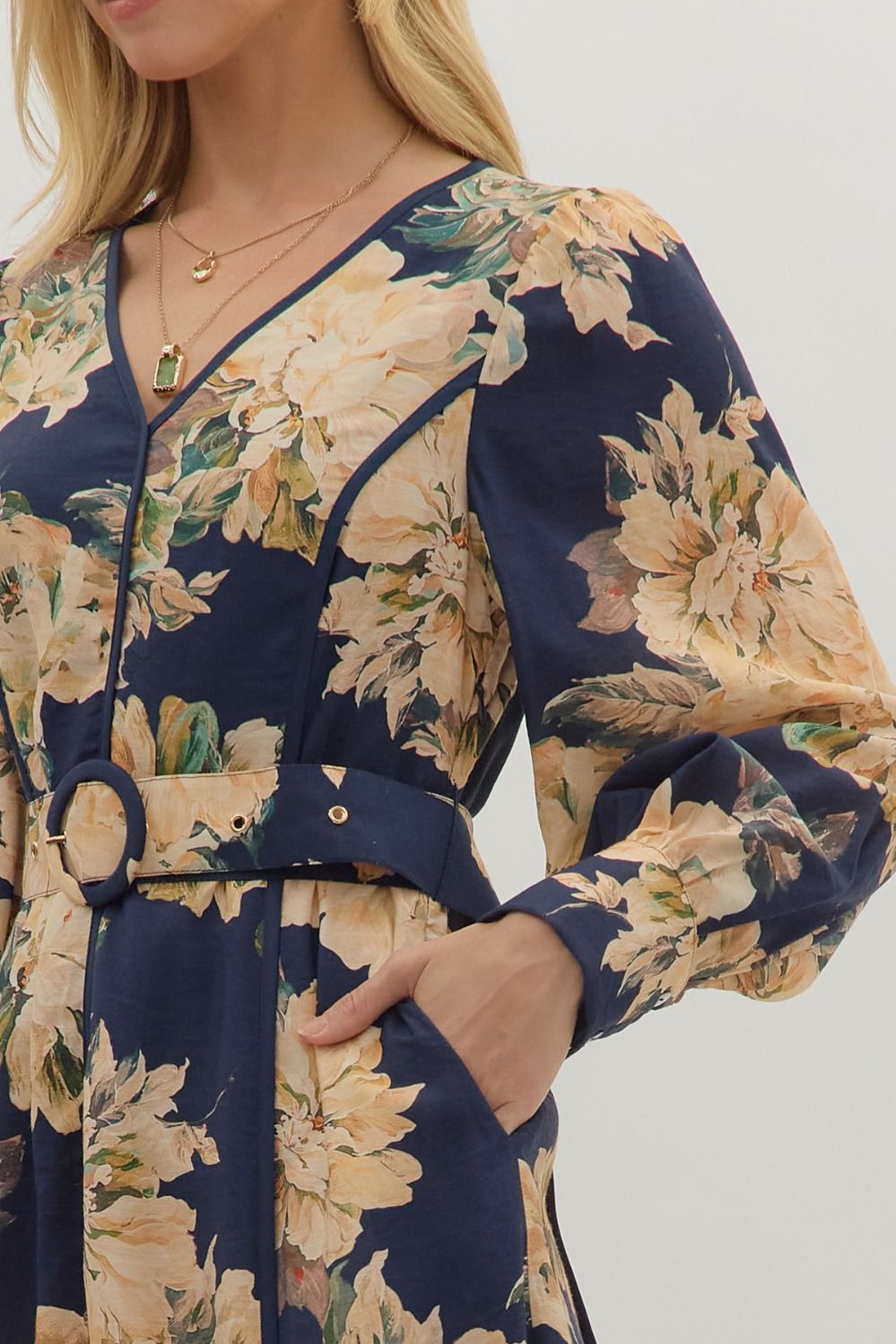 Floral print long sleeve midi dress featuring V-neckline and covered buckle belt. Side pockets.