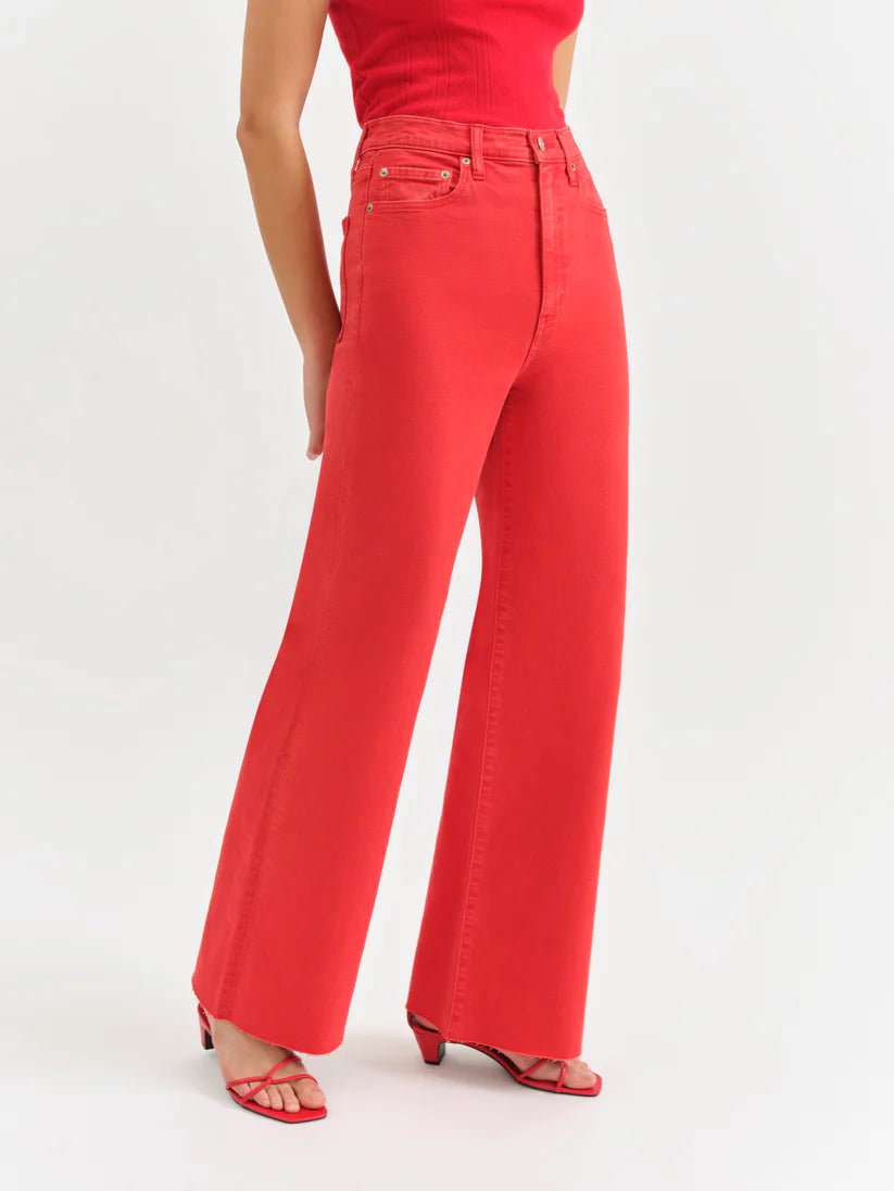 The Far Out in Cherry is an ultra-flattering high rise wide leg jean in a vibrant cherry red hue. Pair with the Lily Baby Tee in Cherry for a bold monochromatic look.
