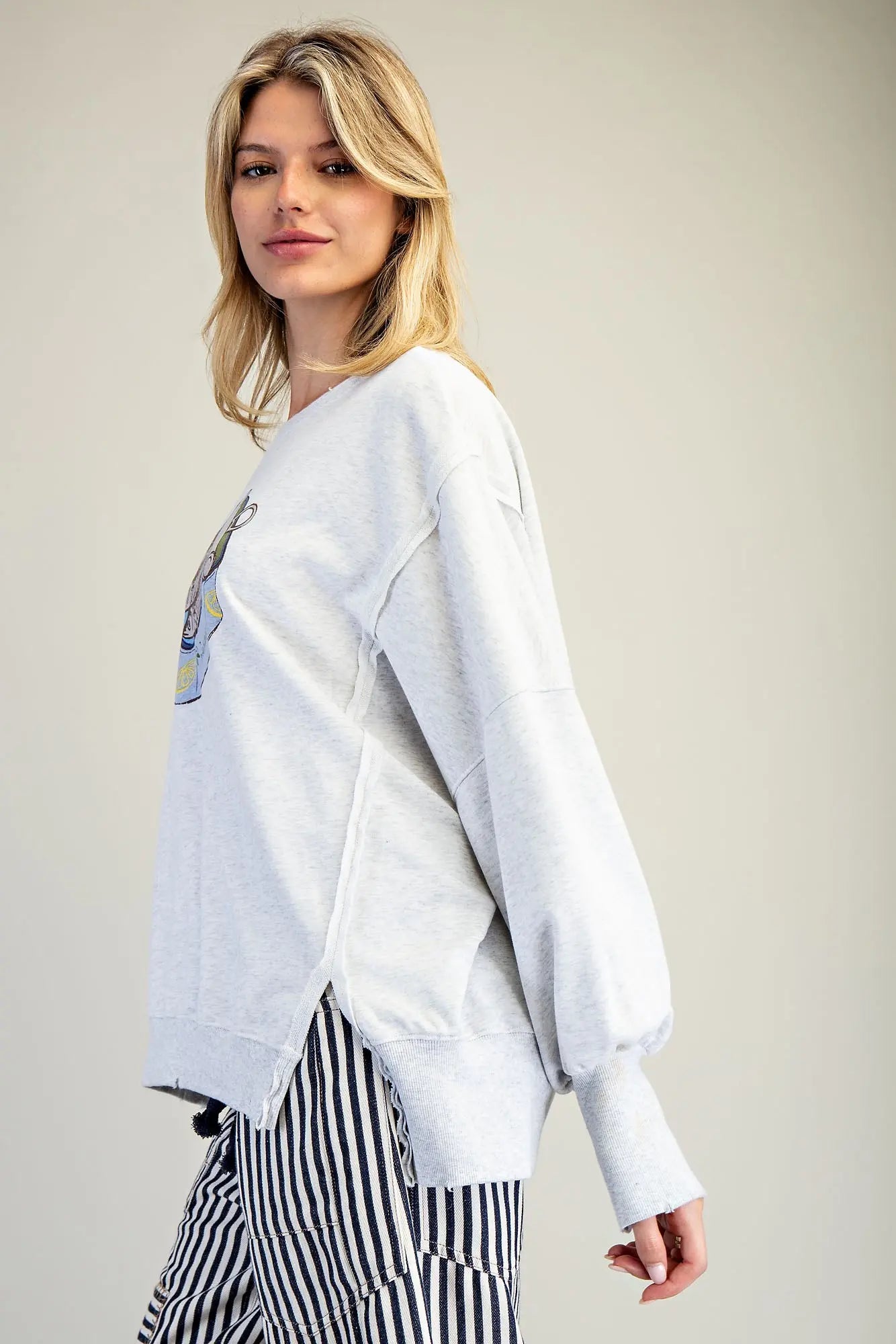 This oversized heather grey sweatshirt showcases a bold sardine can graphic at the chest, exposed raw seam detailing throughout, dropped shoulders with voluminous balloon sleeves, side slits with ribbed trim, and an easy relaxed fit for a playful yet laid back look.