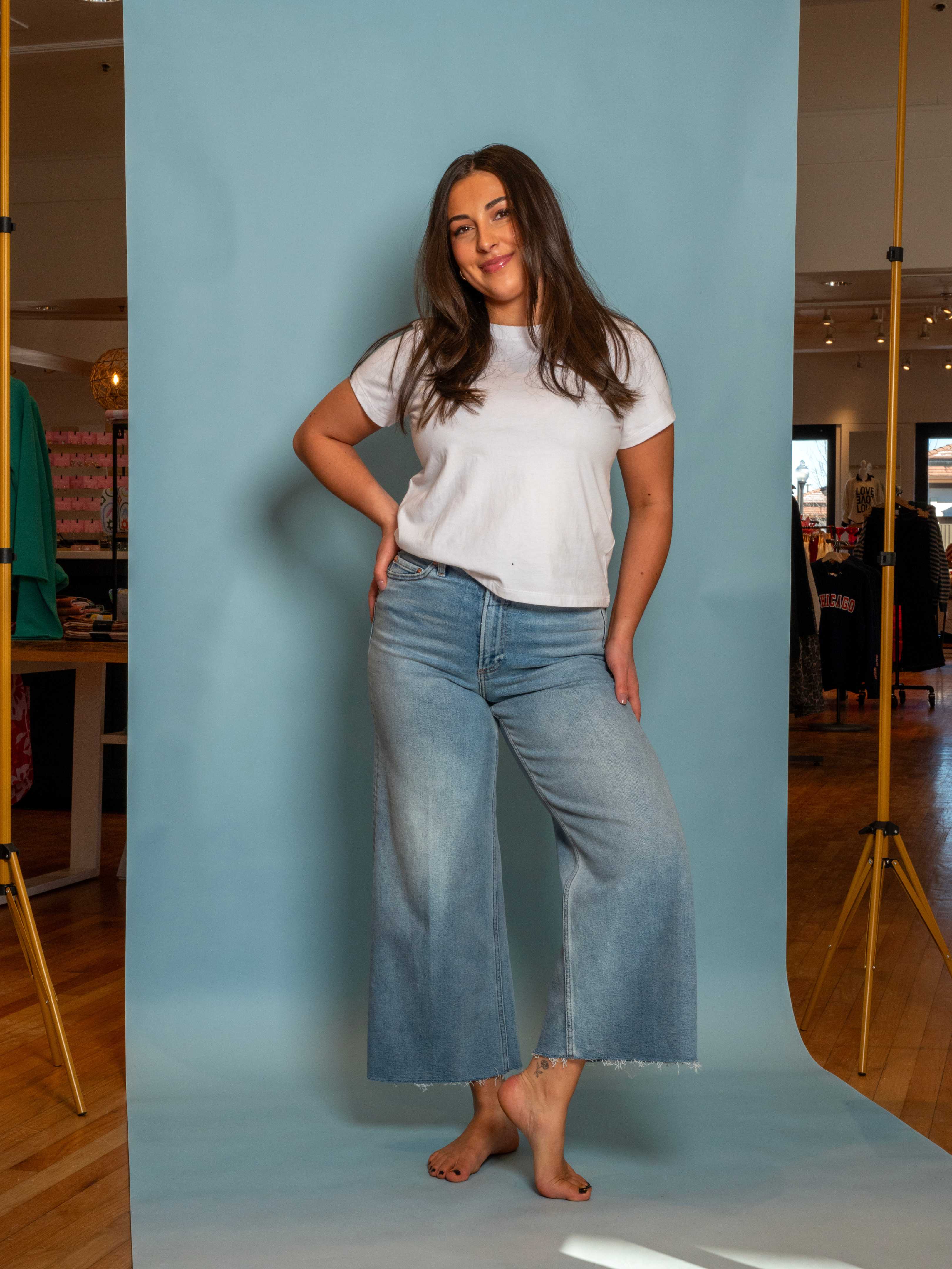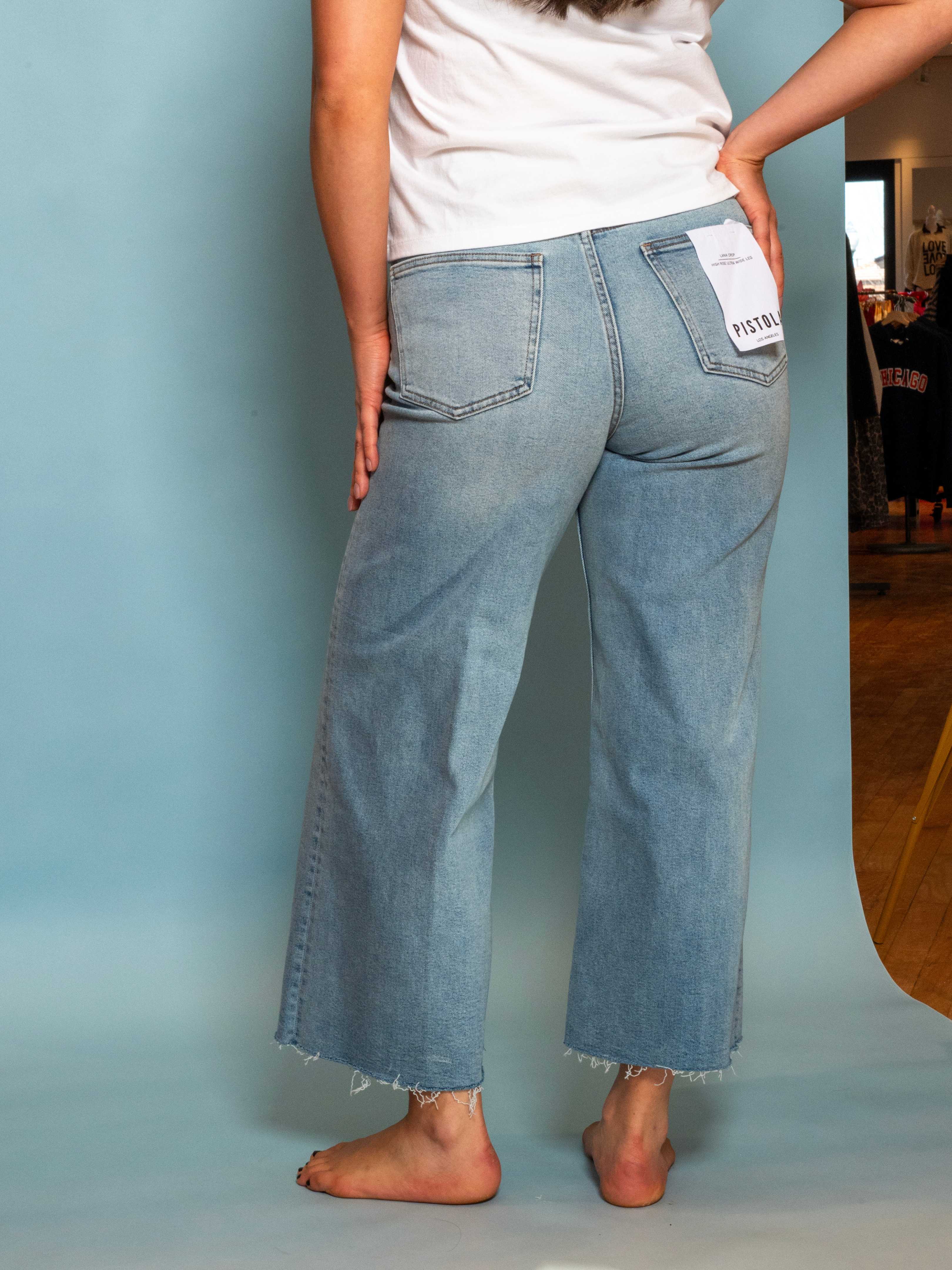 - A best-selling silhouette, Lana sits high at the waist with an ultra wide leg and cropped 27" inseam that delivers easy drama. The raw hem adds lived-in texture, while the relaxed fit moves with understated confidence. Crafted from our signature comfort stretch denim in Bistro, a medium vintage blue wash with natural fading that captures laid-back polish.