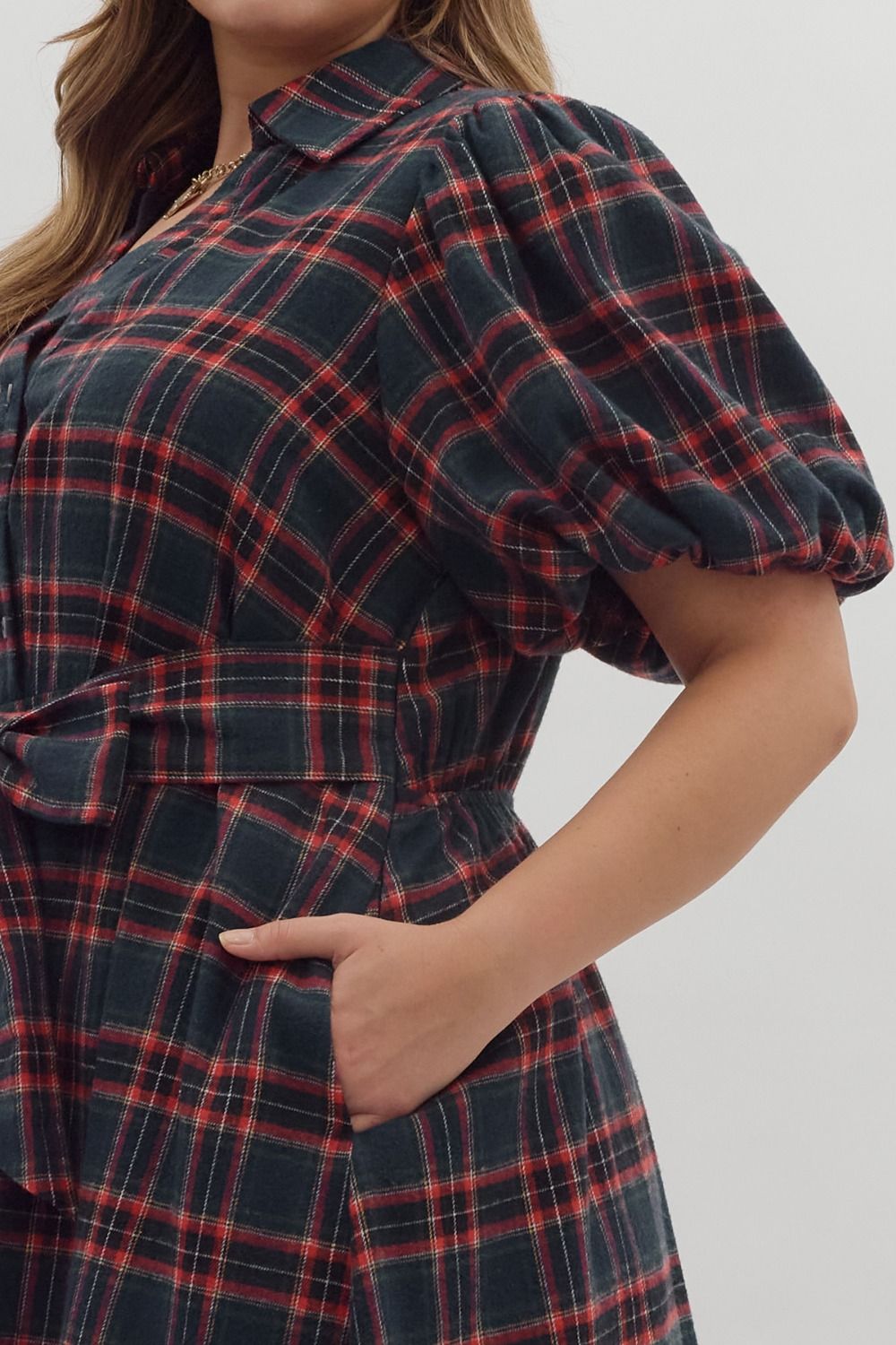 Plaid puff sleeve midi dress featuring self-tie waist belt and button closure at front. Side pockets.