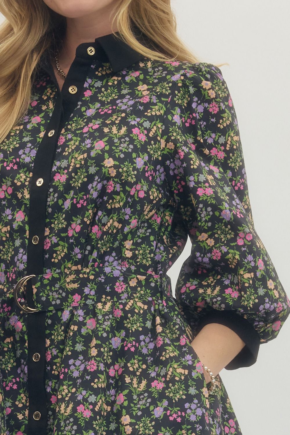 Floral print 3/4 sleeve mini dress featuring waist belt with buckle detail. Button closure at front.